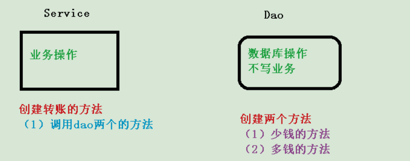 3、在 dao 创建两个方法:多钱和少钱的方法,在 service 创建方法(转账的方法)