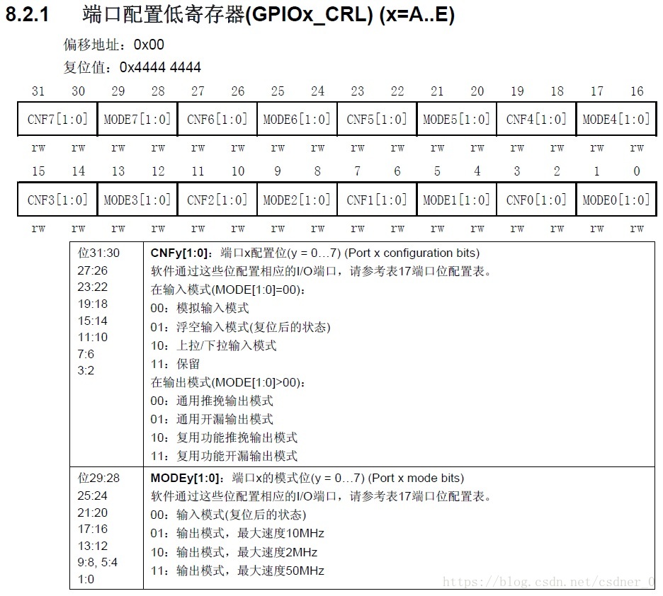 MODER寄存器就是我们需要操作的寄存器。其定义如下: