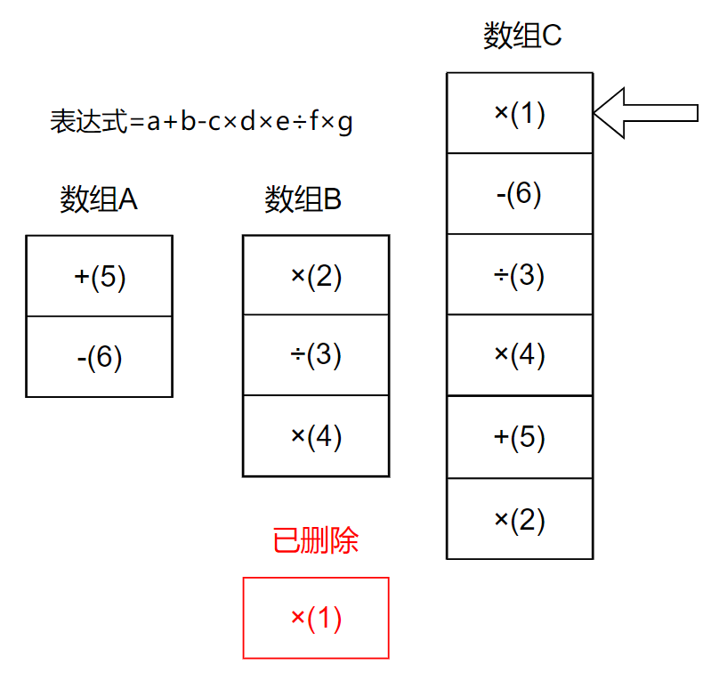 a +(5) b -(6) c ×(1) d ×(2) e ÷(3) f ×(4) g -> 数组A: [×(1), ×(2), ÷(3), ×(4)]. 数组B: [+(5), -(6)],其中()中的数字代表该运算符的id