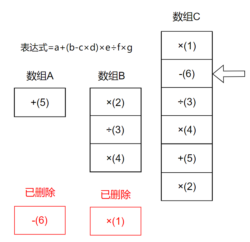 计算数组C的第二个元素-(6),发现数组A还有元素,那么需要套上括号,删除对应id的元素。