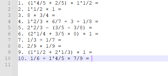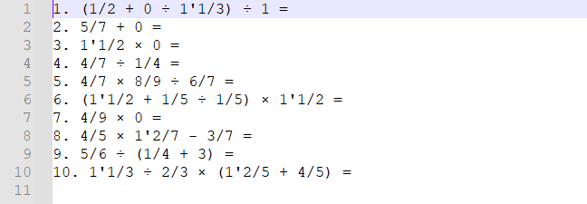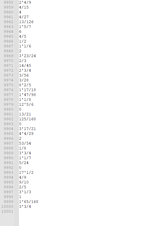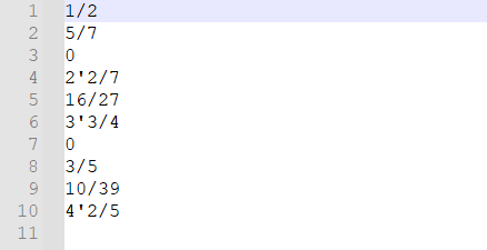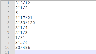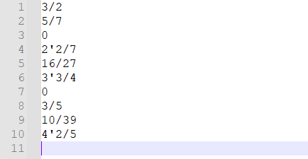 - 那么我就逮着分数算,算出一大坨分数也无所谓,只在最后打印的时候化简,具体化简有"10/1化为10","10/7化为1'3/7"