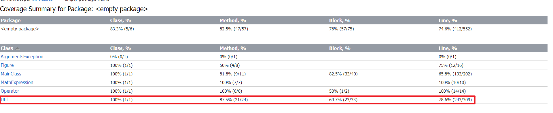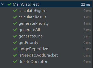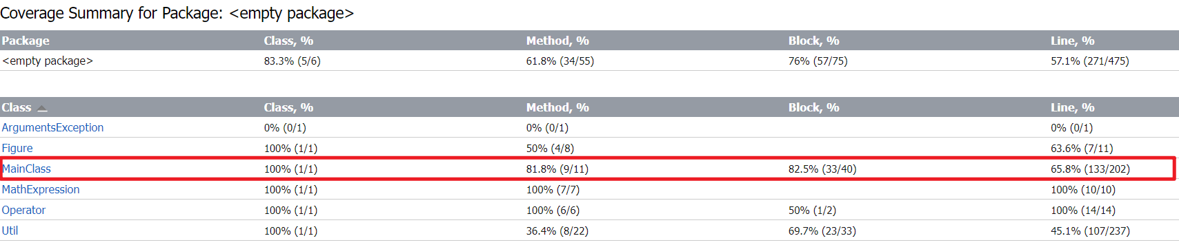 覆盖率如下图,可以看到仅仅只有两个方法没进行测试,而这两个方法一个是main(),一个是MainClass类的无参构造方法