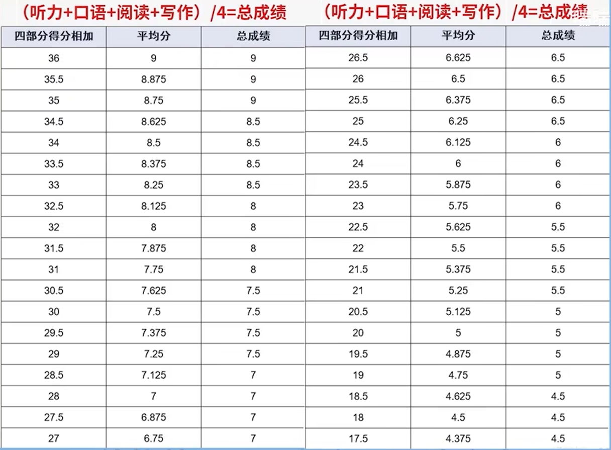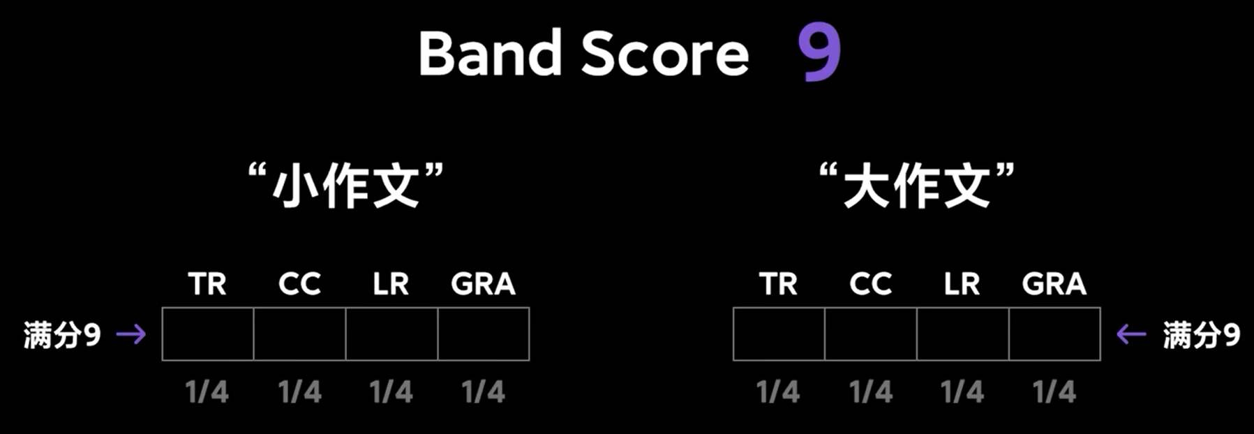 大作文和小作文分别对应一组分数,每组4个分数,对4个标准逐一给整数分(没有小数计分,只使用整数计分[5,6,7,8,9]),每个标准对应满分为9分,总共计4x2=8个分数。每组4个分数求平均分即为单项分,计算平均分不满0.5分或不满1分就退位而不进位,例:6.75分退为6.5分,6.25分退为6分。