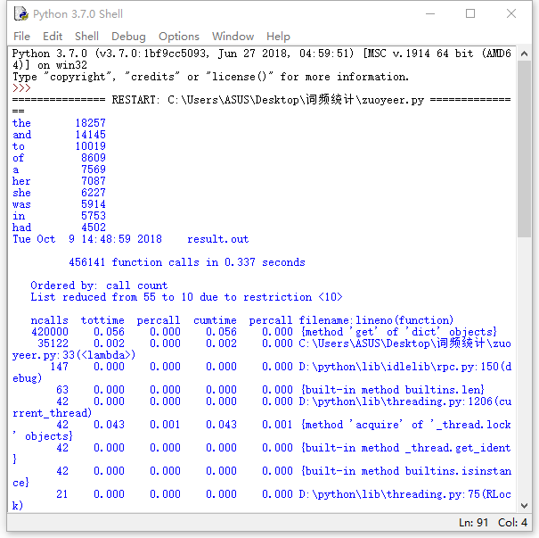 (3)设置输出函数,运用lambda函数对词频排序,并以“词”——“频”格式输出