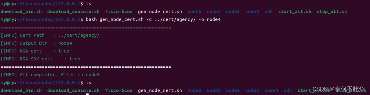 # -o输出到指定文件夹,其中node4/conf中会存在机构agency新签发的证书和私钥