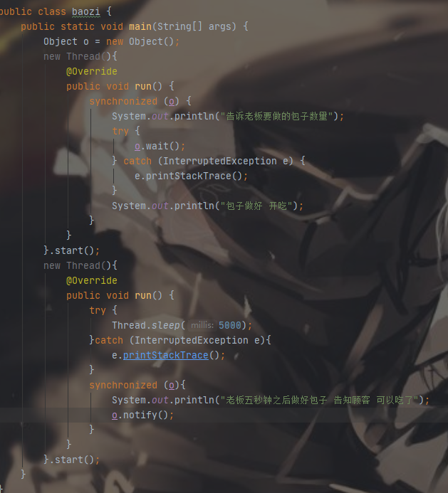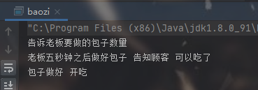 创建一个顾客线程(消费者):告知老板要的包子的种类和数量,调用wait方法,放弃cpu的执行,进入到wAITINc状态(无限等待)创建一个老板线程(生产者):花了5秒做包子,做好包子之后,调用notify方法,唤醒顾客吃包子