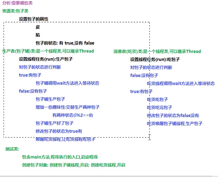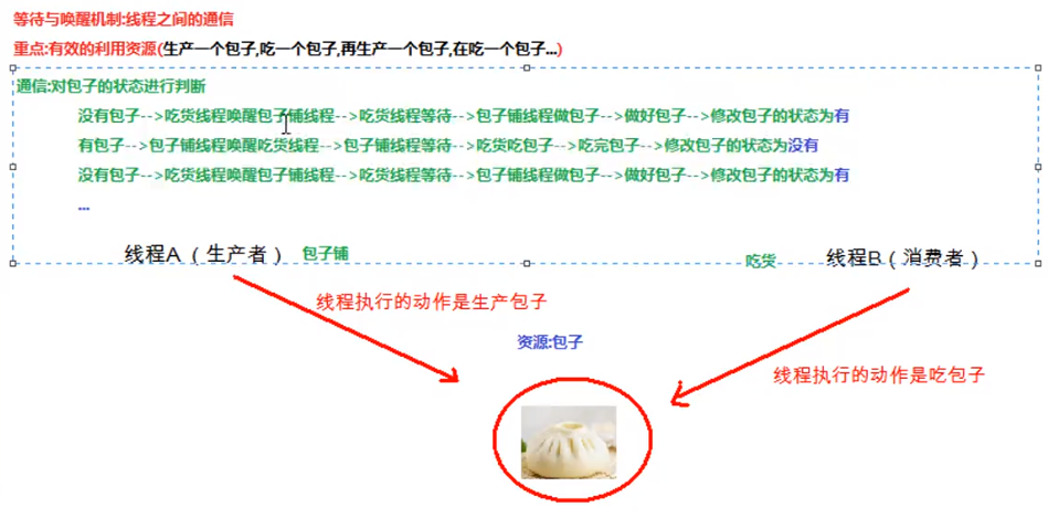 包子铺线程生产包子,吃货线程消费包子。当包子没有时(包子状态为false),吃货线程等待,包子铺线程生产包子(即包子状态为true),