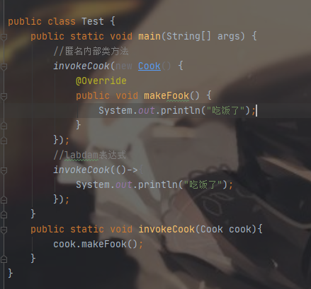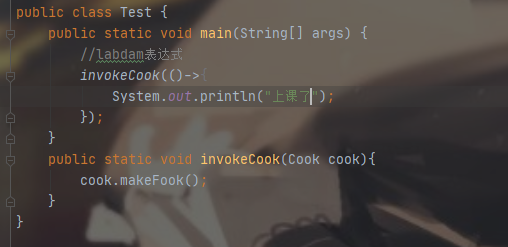 给定一个厨子cook接口,内含唯一的抽象方法makeFood,且无参数、无返回值。使用Lambda的标准格式调用invokeCook方法,打印输出‘吃饭啦!”字样