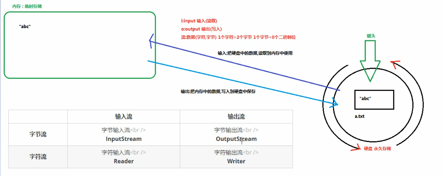 我们把这种数据的传输,可以看做是一种数据的流动,按照流动的方向,以内存为基准,分为输入input|和输出output,即流向内存是输入流,流出内存的输出流。