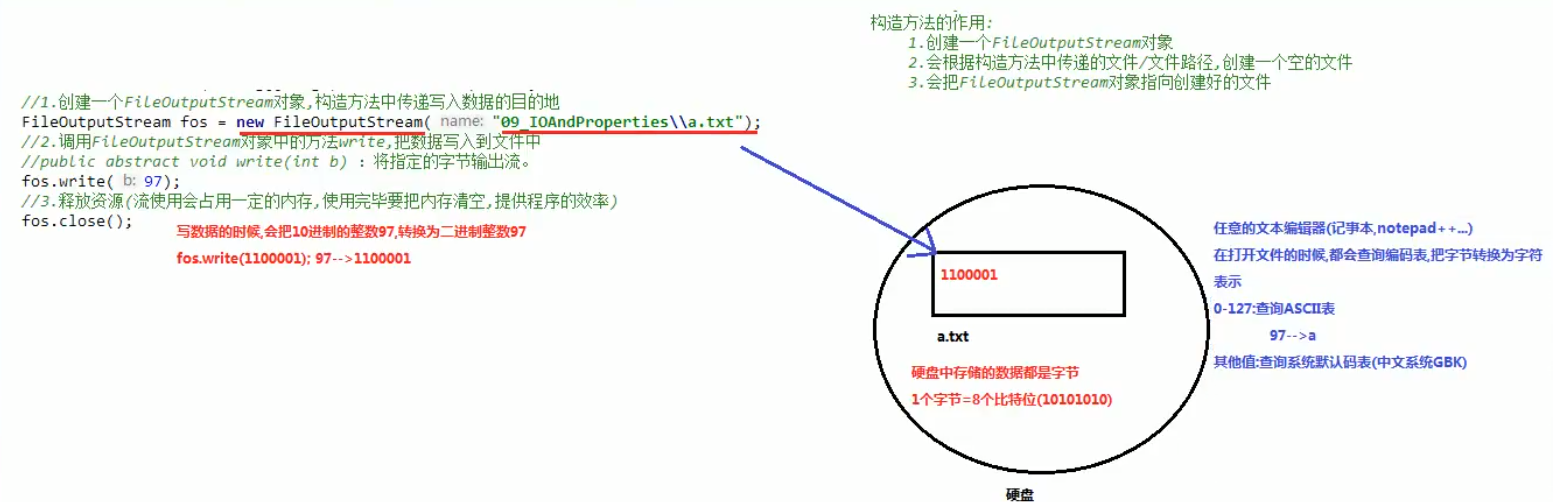 2.会根据构造方法中传递的文件/文件路径,创建一个空的文件3.会把FiLeoutputstream对象指向创建好的文件