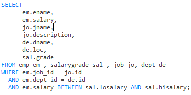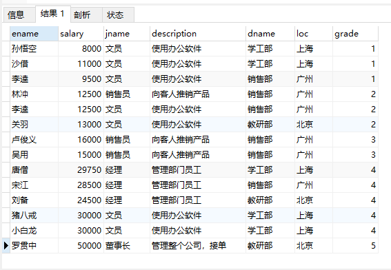 查询员工姓名,工资,职务名称,职务描述,部门名称,部门位置 ,工资等级