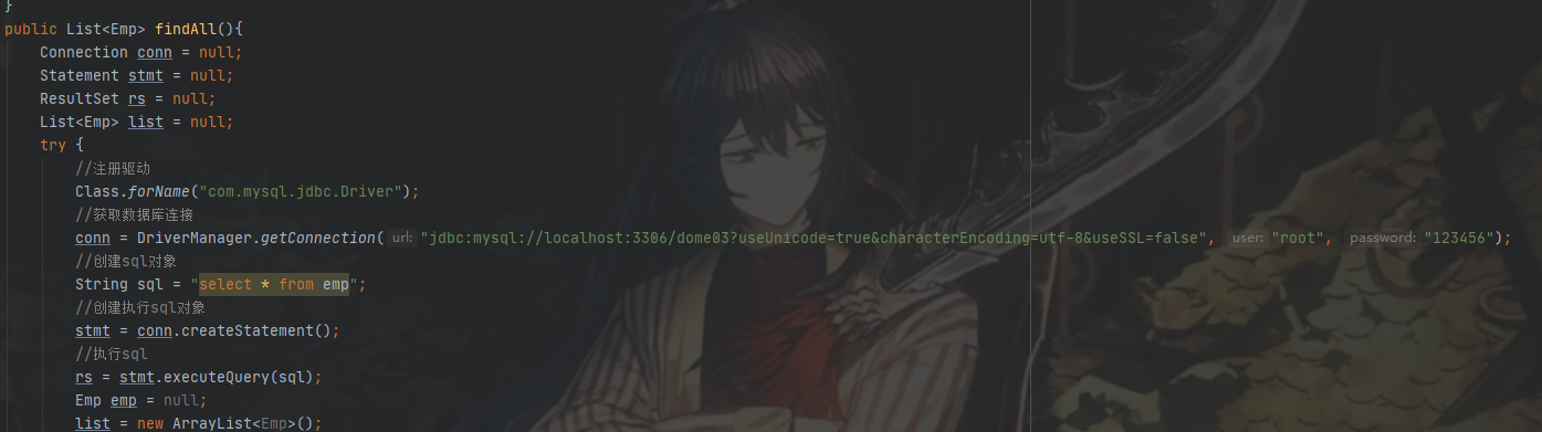 定义一个方法,查询emp表的数据将其封装未对象,然后装载集合,返回