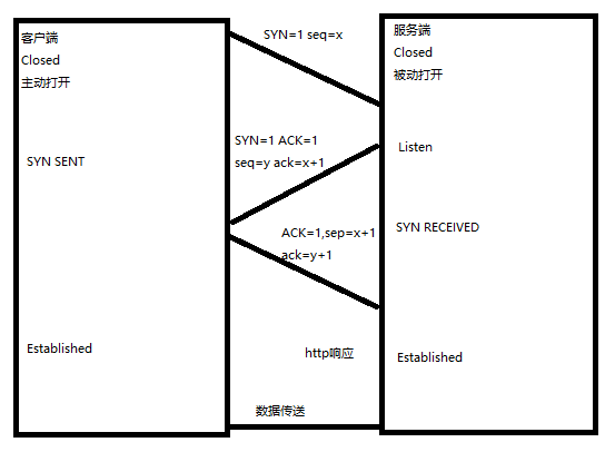 第一次握手:客户端发送带有SYN标志的连接请求报文段 然后进入SYN_SEND状态等待服务端的确认