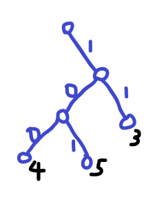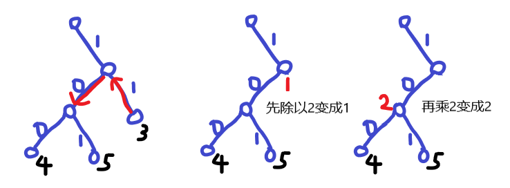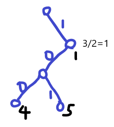 在这个Trie上,我们肯定先进行除以二下取整的操作,再进行乘二操作。(否则你先乘二,之后除以二相当于每进行任何操作)那么我们对一个数进行变换,就相当于将这个节点往祖先走若干步,再向左儿子(也就是数位为\(0\)的边,相当于乘二)走几步。比如将\(A_{1}\)先除以二,再乘以二,就相当于在Trie上进行如下变换: