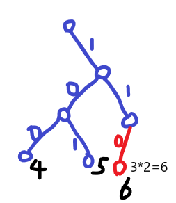 在这个Trie上,我们对某个数乘二就相当于在其末尾加一个\(0\)。比如样例中\(A\)数组,将\(A_{1}=3\)乘\(2\)后,Trie就会变成这个样子: