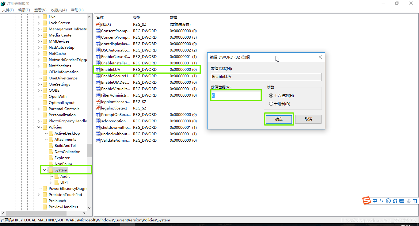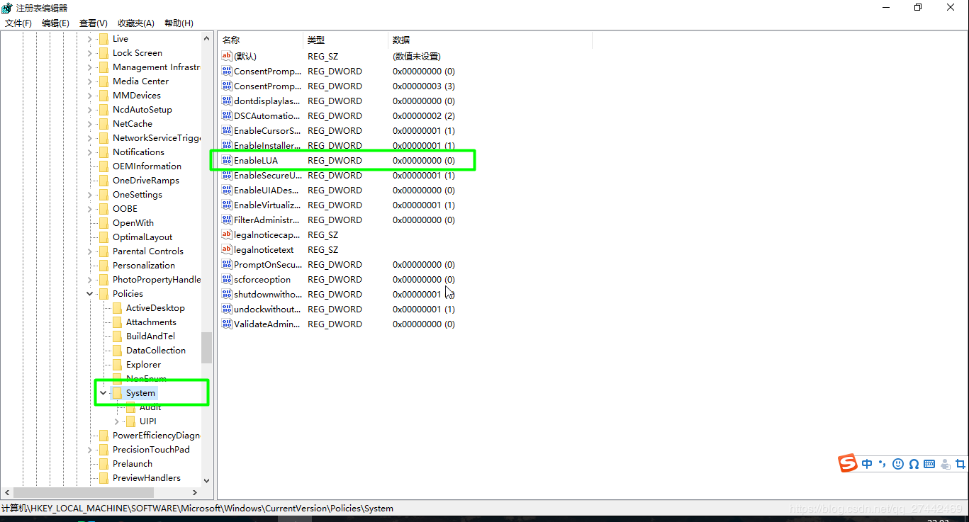 WIN10 EnableLUA是WIN10注册表中的一个键值,它所在的位置是: