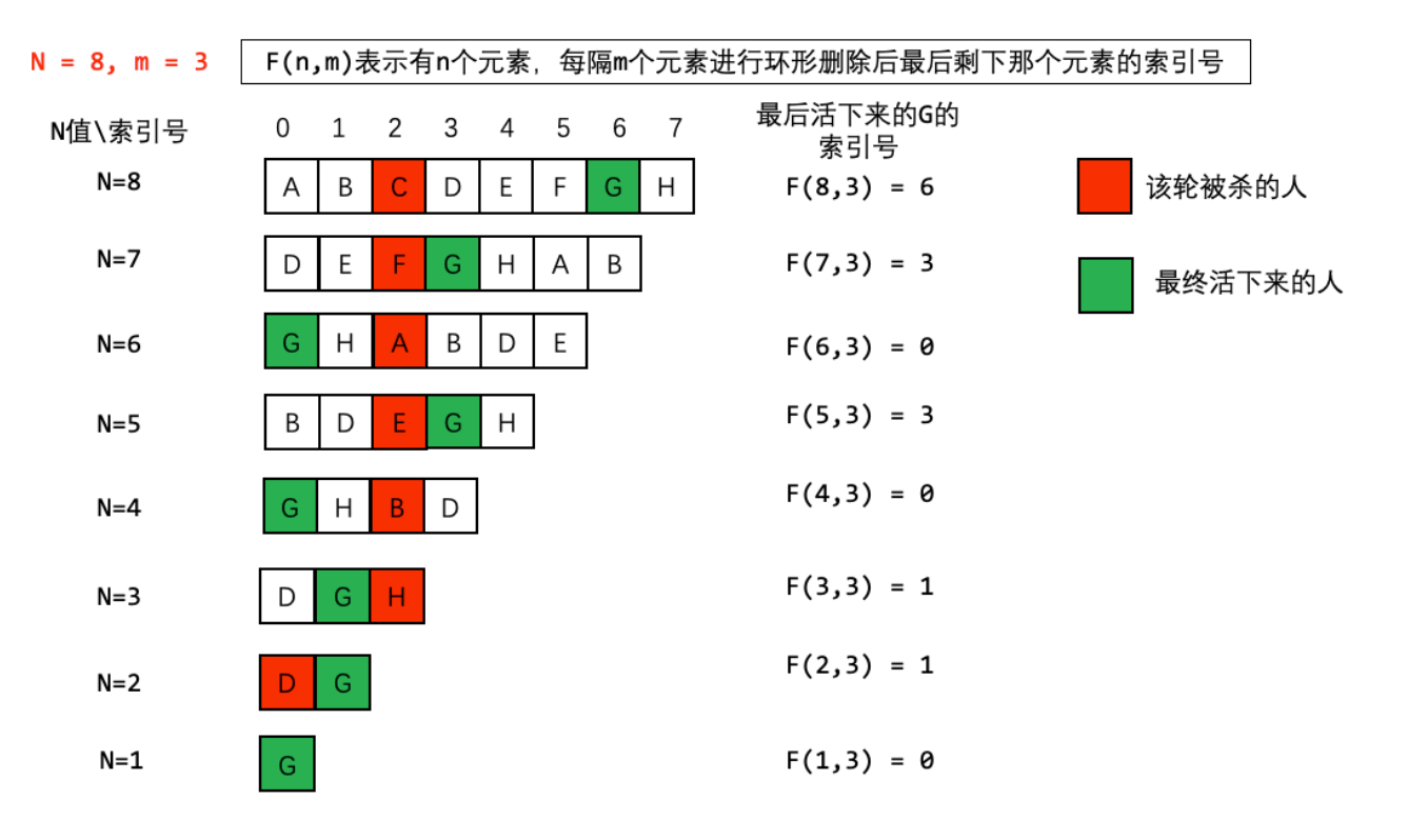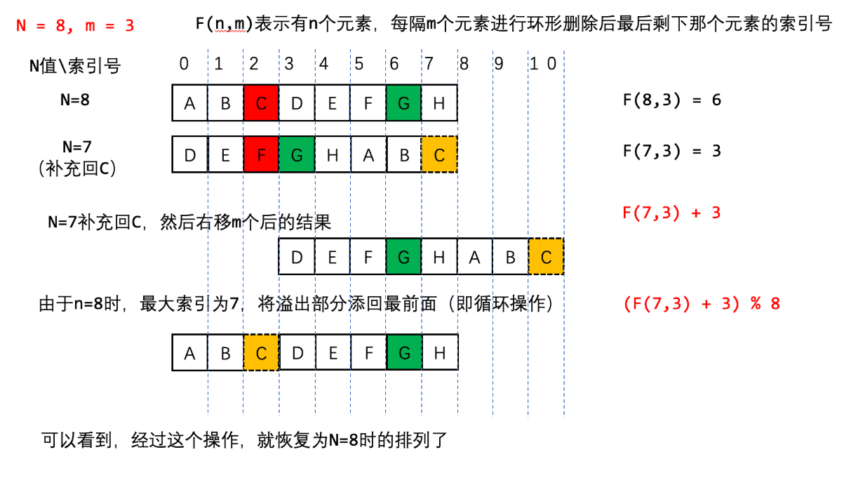 因此我们可以推出递推公式f(8,3) = [f(7, 3) + 3] % 8