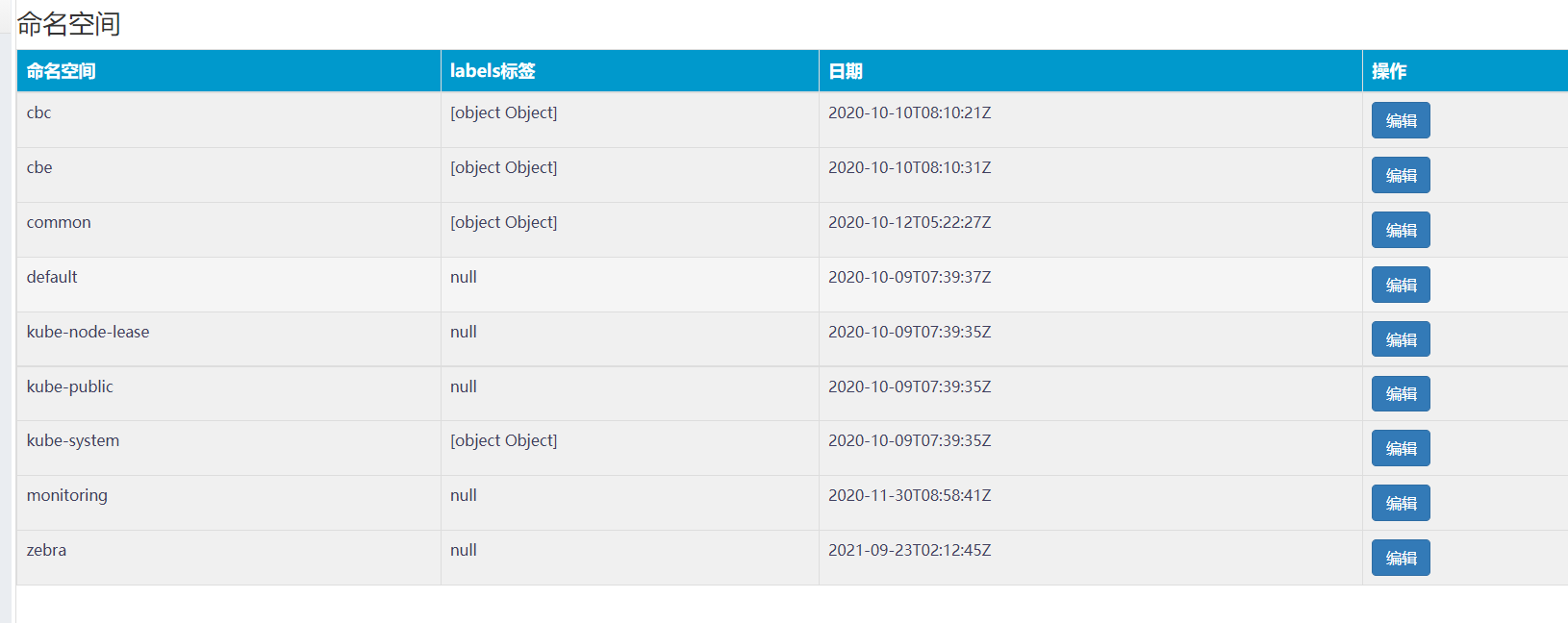 html += "<thead><tr><th>命名空间</th> + <th>labels标签</th> + <th>日期</th>+<th>操作</th></tr></thead>"