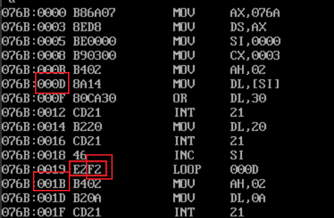 - 对于loop而言,操作数是循环开始的地址与loop指令下一条指令的地址之差,且以补码的形式呈现