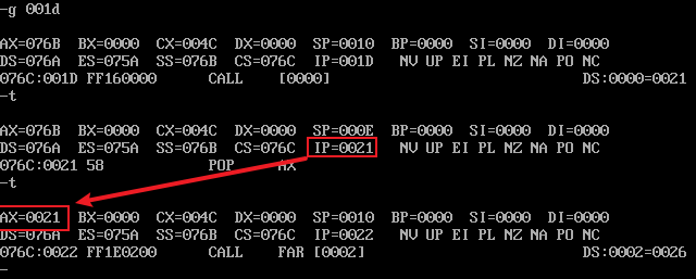 - ax中存放着s1代码段的地址中的段内偏移地址部分,即执行call word ptr ds:[0]时的ip寄存器中的数值