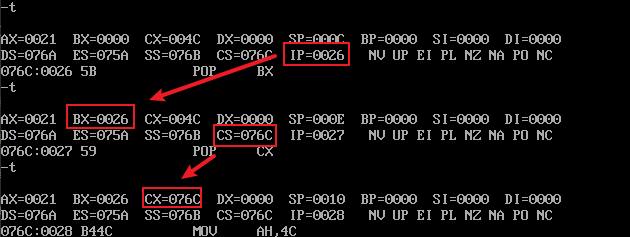 - cx中存放着s2代码段的地址中的段地址部分,即执行call dword ptr ds:[2]时的cs寄存其中的数值