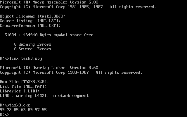 assume cs:code, ds:data data segment x db 1, 9, 3 len1 equ $ - x y dw 1, 9, 3 len2 equ $ - y data ends code segment start: mov ax, data mov ds, ax mov si, offset x mov cx, len1 mov ah, 2 s1:mov dl, [si] or dl, 30h int 21h mov dl, ' ' int 21h inc si loop s1 mov ah, 2 mov dl, 0ah int 21h mov si, offset y mov cx, len2/2 mov ah, 2 s2:mov dx, [si] or dl, 30h int 21h mov dl, ' ' int 21h add si, 2 loop s2 mov ah, 4ch int 21h code ends end start