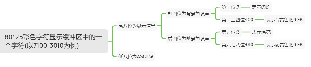 - 所占用的一个字节中,高八位为色彩信息,低八位为ASCII码