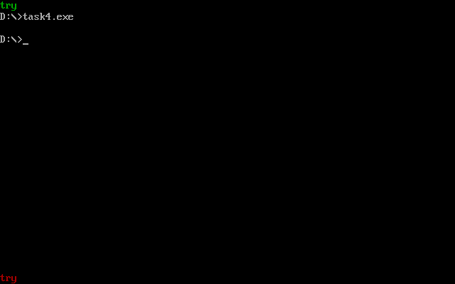 1 assume cs:code, ds:data 2 data segment 3 str db 'try' 4 len equ $- str 5 data ends 6 7 code segment 8 start: 9 mov ax,data 10 mov ds,ax 11 12 mov si,offset str 13 mov cx, len 14 mov bl, 00000010B ;存颜色信息---黑底绿色 15 mov bp, 00 ;存第一行的位置 16 mov ax, 0B800H ;80*25彩色字符显示区域的段地址 17 mov es, ax 18 19 s1: call printStr 20 loop s1 21 22 mov bl,00000100B ;存颜色信息---黑底红色 23 mov bp,0F00H ;存最后一行行的位置 24 mov cx,len ;设置循环次数 25 mov si,offset str 26 27 s2: call printStr 28 loop S2 29 30 mov ah, 4ch 31 int 21h 32 33 34 printStr: 35 mov al, ds:[si] 36 mov es:[bp],al 37 inc bp 38 inc si 39 mov es:[bp],bl 40 inc bp 41 42 ret 43 44 45 code ends 46 end start