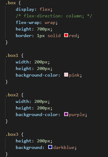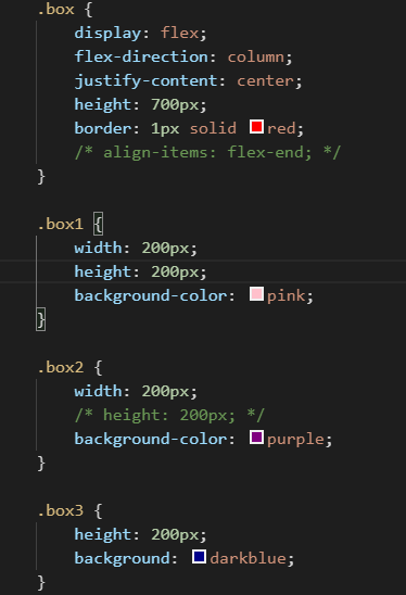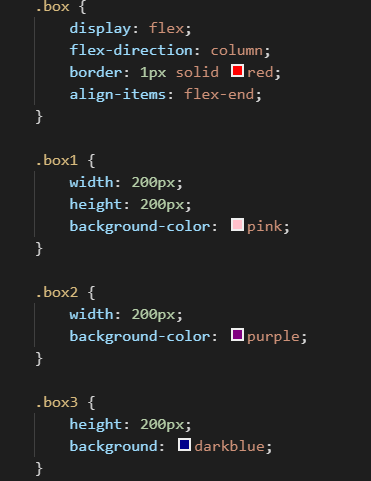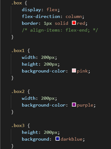 box1和box3展现了出来,而box2却没有。这是因为在flex-direction设置改为column后,垂直轴变成主轴,而水平轴成了侧轴,align-items是控制侧轴的属性,如果没有写,默认为stretch。