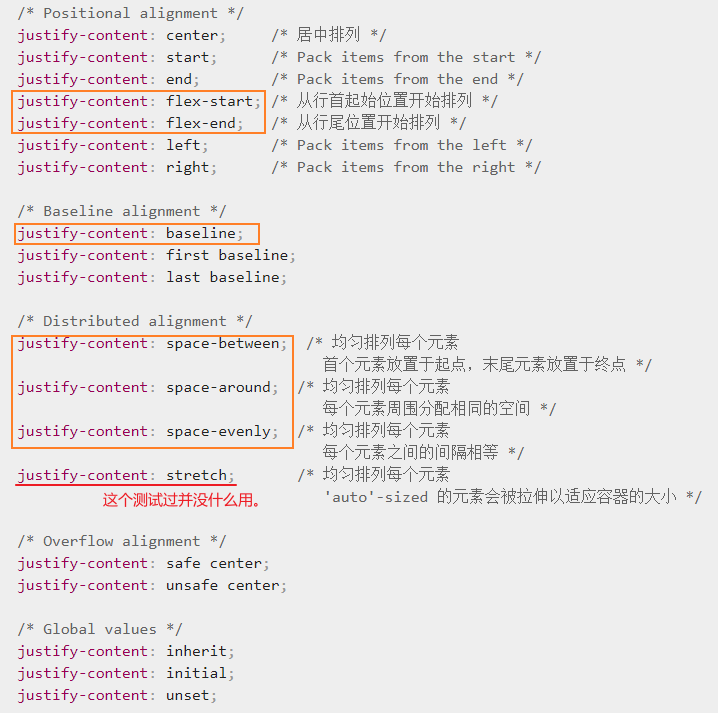 这里是justify-content的常用属性: