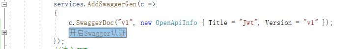 1 #region 开启Swagger认证 2 c.AddSecurityDefinition("Bearer", new OpenApiSecurityScheme() 3 { 4 5 Description = "在下框中输入请求头中需要添加Jwt授权Token:Bearer Token", 6 Name = "Authorization", 7 In = ParameterLocation.Header, 8 Type = SecuritySchemeType.ApiKey, 9 BearerFormat = "JWT", 10 Scheme = "Bearer" 11 }); 12 13 c.AddSecurityRequirement(new OpenApiSecurityRequirement 14 { 15 { 16 new OpenApiSecurityScheme 17 { 18 Reference = new OpenApiReference { 19 Type = ReferenceType.SecurityScheme, 20 Id = "Bearer" 21 } 22 }, 23 new string[] { } 24 } 25 }); 26 #endregion