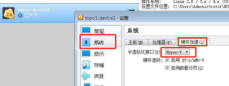 设备关闭状态下修改设备 系统的硬件加速为 hyper-V