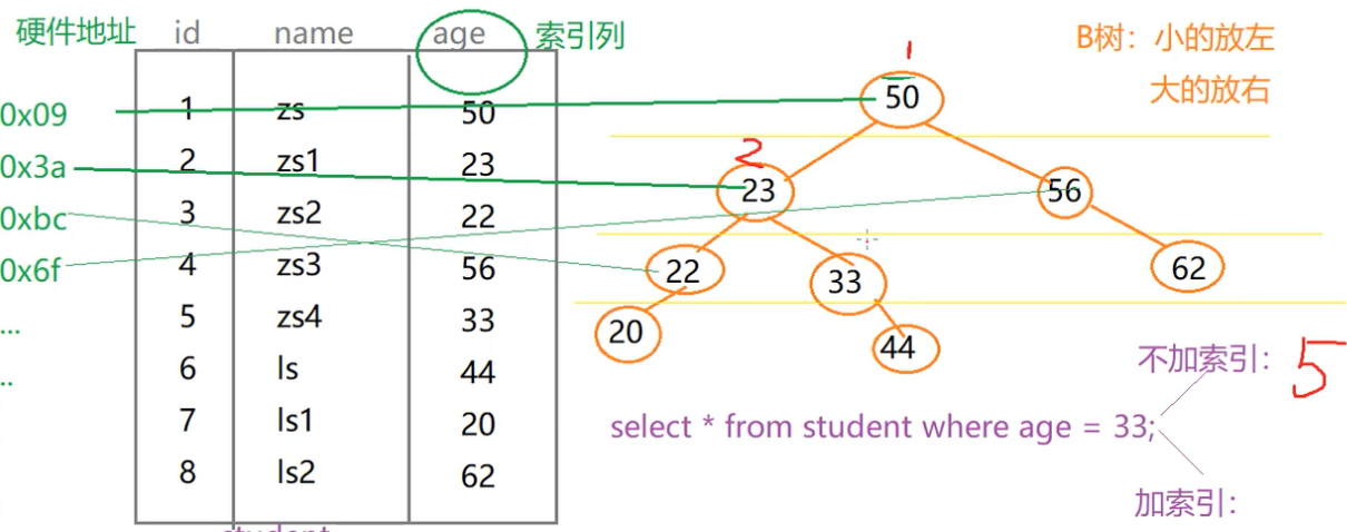 索引:相当于书的目录。index:帮助高效获取数据的数据结构。树:B树(小的放左,大的放右)(Mysql)