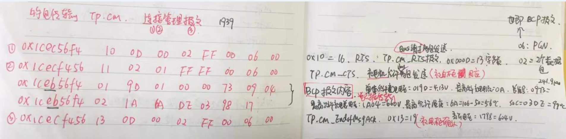 BMS发送组帧报文时,会先发送一条ID为0x1cec56f4的报文,用来告知充电柜开始组帧报文的传输。实际应用时直接看第七字节内容即可识别此组组帧报文所对应的的PGN。