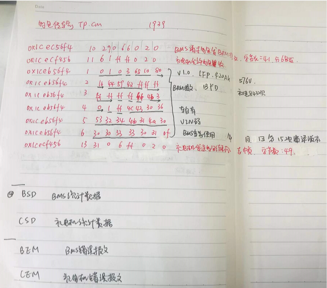 当报文的数据长度超过8个字节时,在CAN网络上将会按照组帧报文格式进行传输。直流充电国标中,在充电的每个阶段最多有一条数据长度超过8的报文,均为BMS发送出来的。下图是直流充电网中的BRM、BCP两条报文。