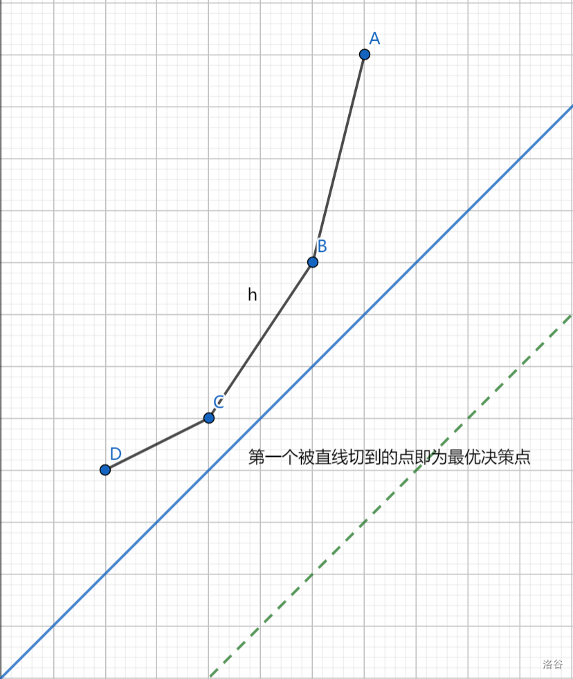 我们发现 B 点可能成为最优决策点当且仅当:\(slope(A,B) < slope(B,C)\)。其中,\(slope(P,Q)\) 表示两点间的斜率。