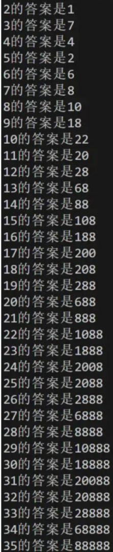 又发现,周期为 \(\bf7\),在 \(n\ge20\) 时,可以通过在 \(n\in[8,14]\) 的结果的数后添 \(8\) 得到。(要看好间隔!5555)
