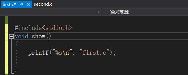 因为main()函数在second.c文件中,而且second.c文件中已经把它自己文件中的show()函数定义为了内部函数,所以first.c文件中的show()函数不会被second.c中的main()函数调用。
