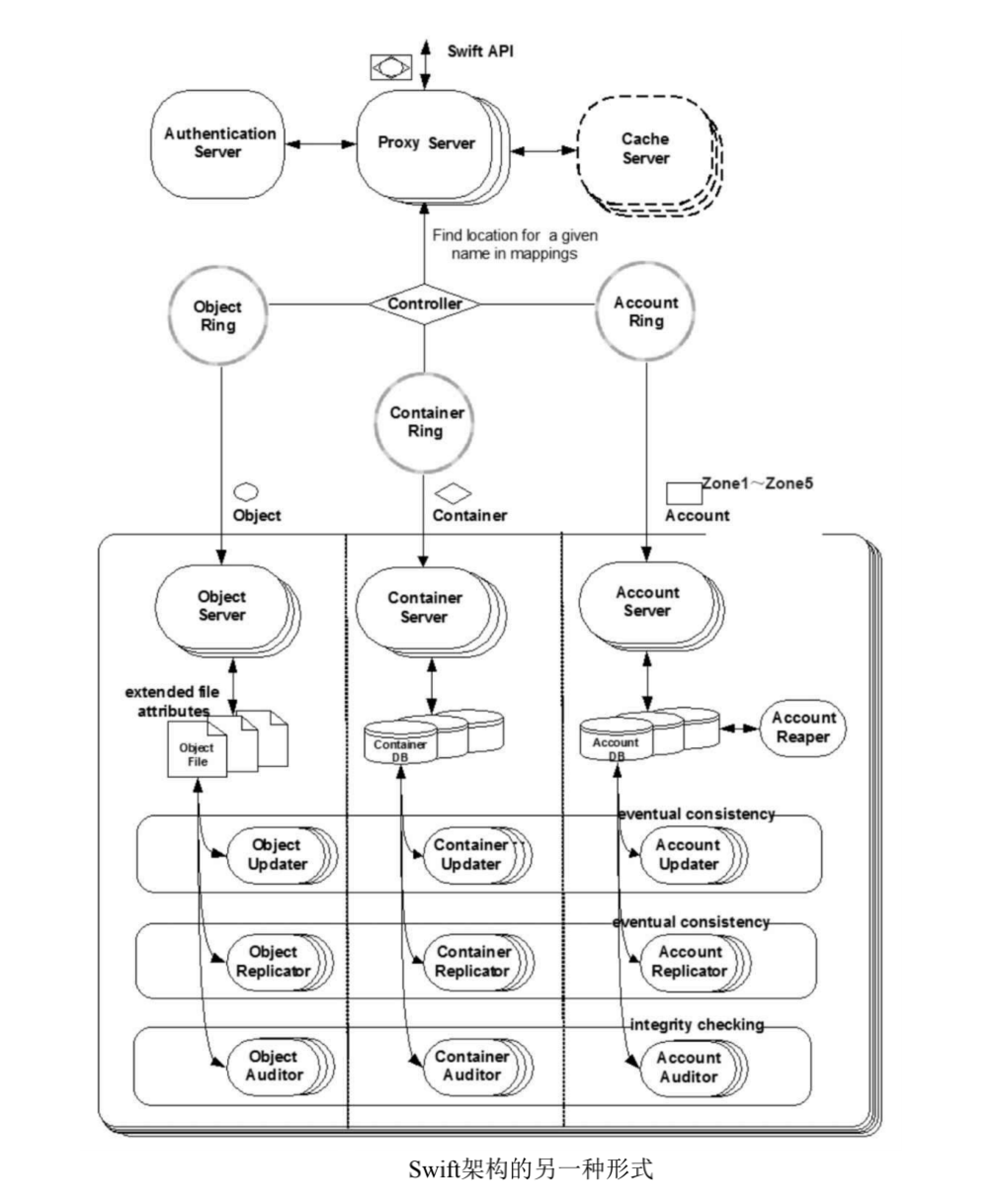 Swift 引入环的概念来解决如何将对象与真正的物理存储位置相互映射的问题.环记录了存储对象与物理位置之间的映射关系,Account、Container 和 Object 都有自己独立的环,当 Proxy Server 接收到用户请求时,会根据所操作的实体(Account、Container 和 Object)寻找对应的环,来确定他们在存储服务器集群中的具体位置,Account、Container 和 Object 在环中的位置信息,也由 Proxy Server 来进行维护.