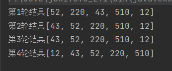 public class InsertionAlgorithm { public static void main(String[] args) { int[] arr = {220, 52, 43, 510, 12}; for (int i=1;i< arr.length;i++) { //第i轮 //插入的数为arr[i] int insertVal = arr[i]; //被插入的位置,即与他前面的一位比较,其下标为i-1 int index = i - 1; //给insertVal找到插入的位置 // 说明 //1. Index >=0保证在给insertVal找插入位置,不越界 //2. insertVal < arr[Index]待插入的数,还没有找到插入位置 //3。就需要将arr[Index]后移一位 while (index >= 0 && insertVal < arr[index]) { //将数组中的arr[index]向后移一位,即220 arr[index + 1] = arr[index]; //让index向前移动,即继续向前比较,直到找到插入位置,跳出循环 index--; } //跳出循环,找到插入位置 //这里index+1是因为上面跳出循环时,index=-1 arr[index + 1] = insertVal; System.out.println("第"+i+"轮结果" + Arrays.toString(arr)); } } }