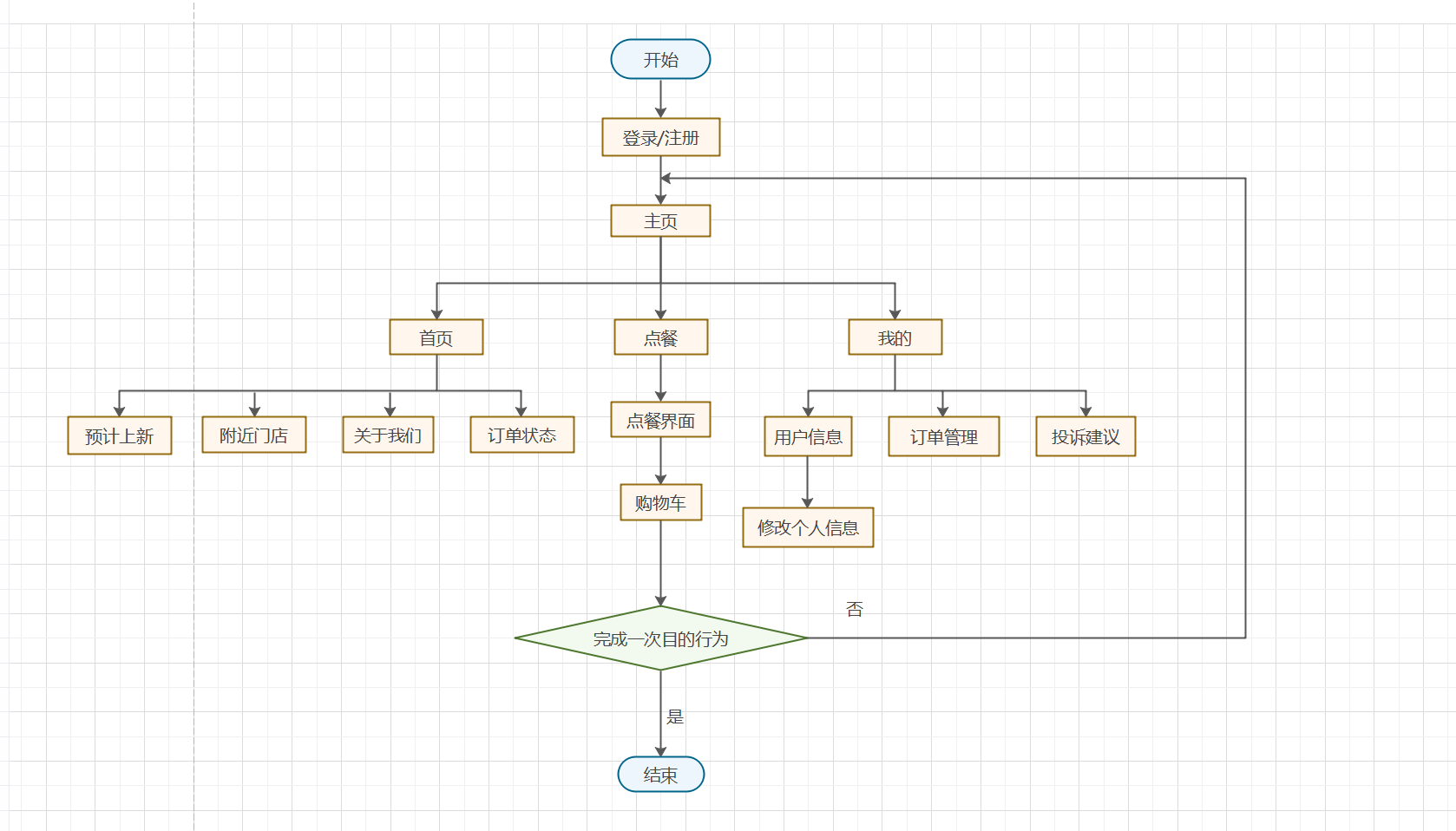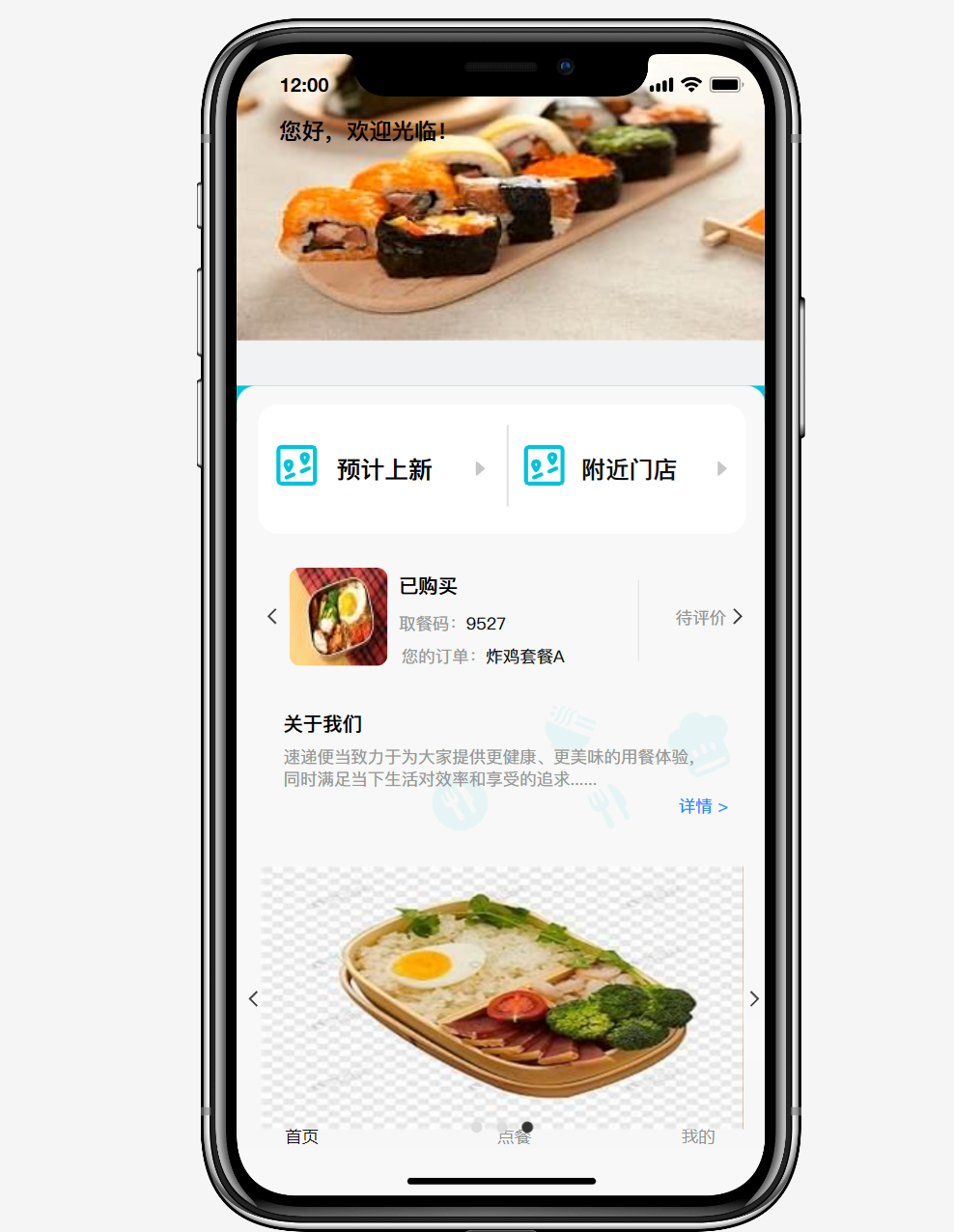 选择浏览首页内容或进入 点餐 页面与 我的 界面