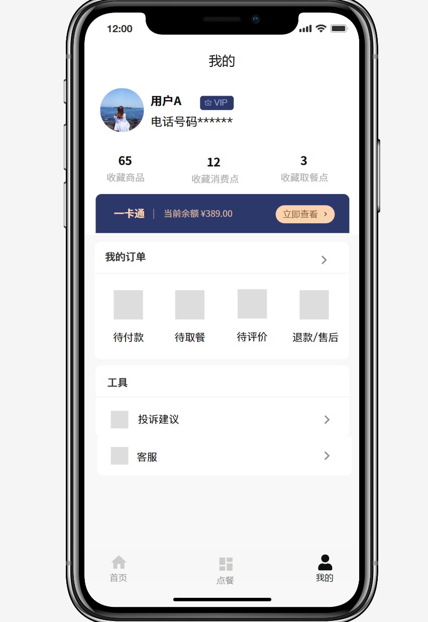 选择 我的 页面,浏览或修改用户个人信息、管理历史订单、选择投诉建议或寻求客户服务