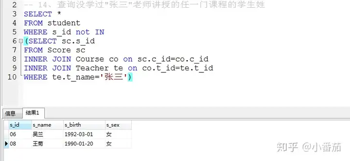 5、查询没学过“张三”老师课的学生的学号、姓名(重点)