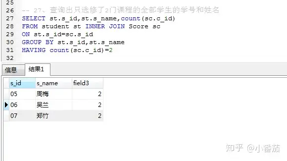 27、 查询出只有两门课程的全部学生的学号和姓名(不重点)