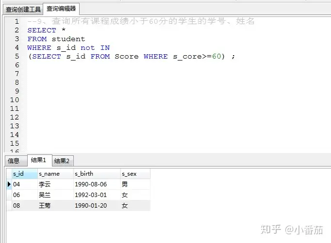 9、查询所有课程成绩小于60分的学生的学号、姓名