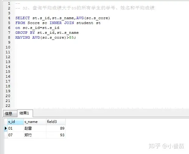 32、查询平均成绩大于等于85的所有学生的学号、姓名和平均成绩(不重要)