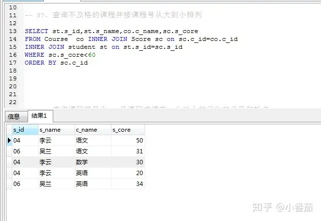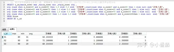 23、使用分段[100-85],[85-70],[70-60],[<60]来统计各科成绩,分别统计各分数段人数:课程ID和课程名称(重点和18题类似)