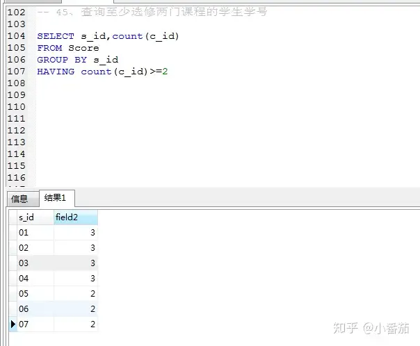 44、检索至少选修两门课程的学生学号(不重要)