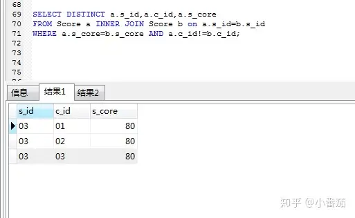 区别:法一是from 三个表连接,s_core分为两列,法二:a和b作为子查询,s_core为一列