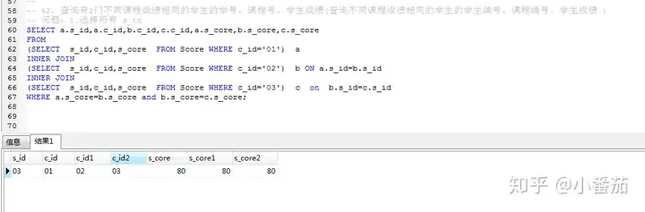 41.查询不同课程成绩相同的学生的学生编号、课程编号、学生成绩 (重点)